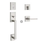 Kwikset San Clemente Front Door Lock Handle and Deadbolt Set, Entry Handleset Exterior with Interior Reversible Lever, Satin Nickel, Pick Resistant SmartKey Rekey Deadbolt Security